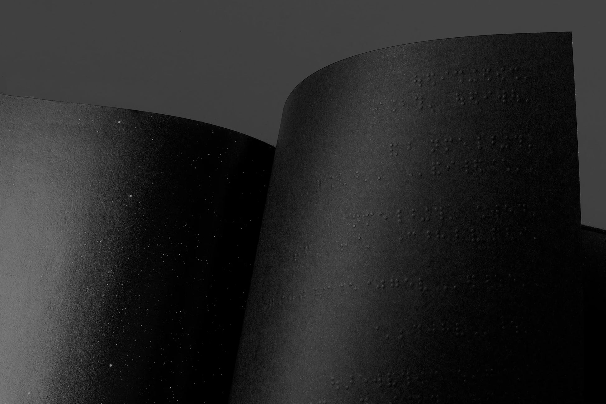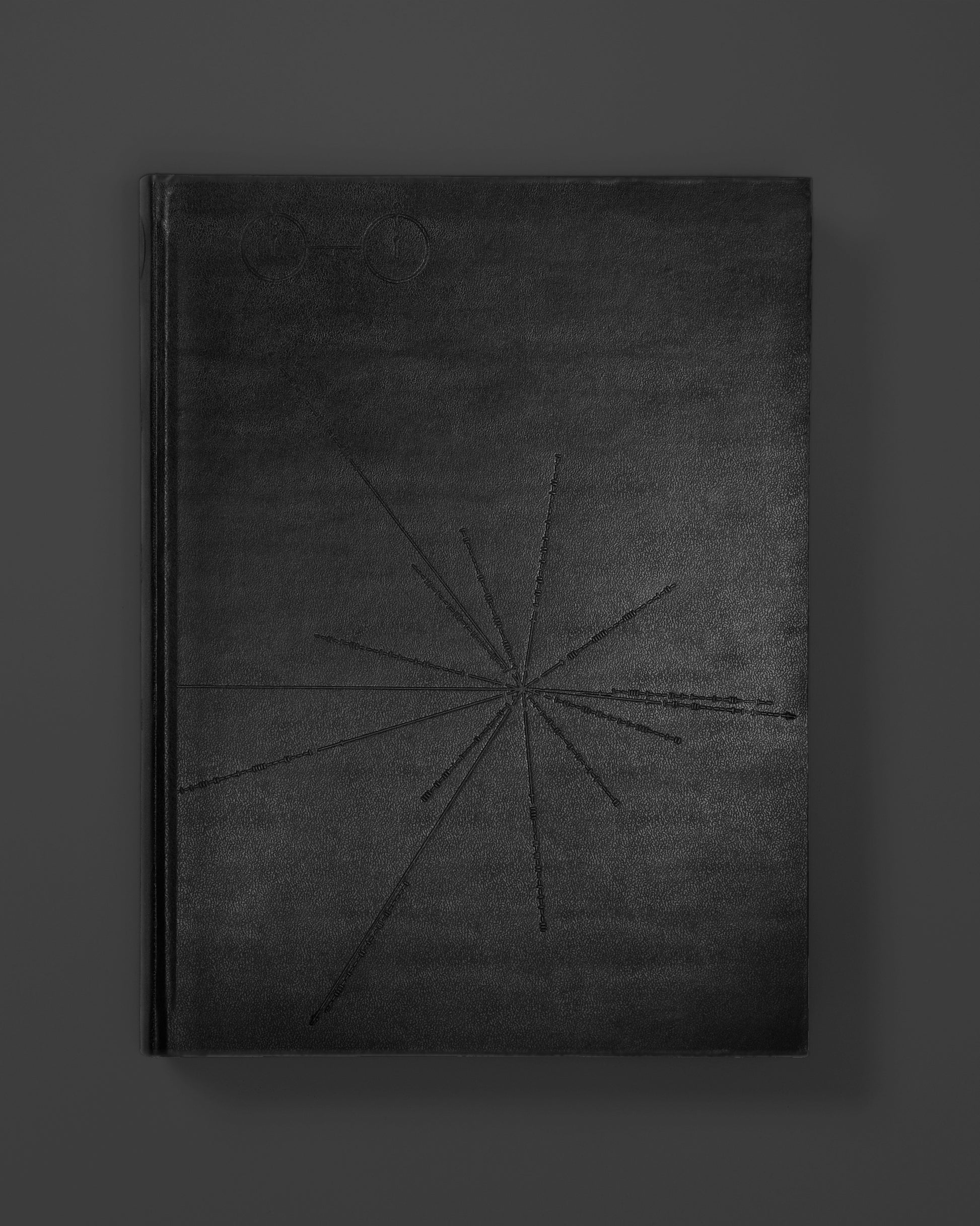 The monolithic publication is painstakingly hand-bound in leather bearing totemic coordinates to the planet Earth, blind stamped end sheets, black sprayed edges, and a loose steel plaque, that once removed, leaves the volume without language.