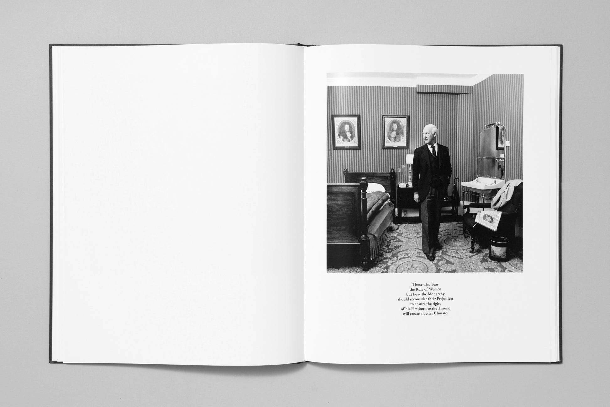 The complete series of 26 images and texts investigate the values that ally these classes to conservative aristocratic values where primogeniture (the right by law of the rstborn son to inherit his parent’s estate, in preference to daughters) is still an issue. Until the early 1970’s a married women still needed her husband’s endorsement for any household purchases. Whilst women now have full property rights, they still remain under-represented in key positions of governance and in nancial and academic worlds. It is still a boys club in which some women are honorary members.